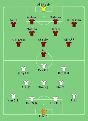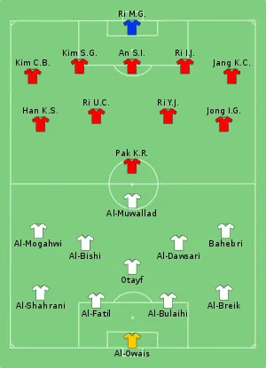 The first chance of the game came in the 13th minute through Abdulaziz Al-Bishi’s left-footed strike which just missed the target. In the 28th minute, Hattan Bahebri dribbled past Ri Il-jin and sent a curler from the left to give Saudi Arabia the lead. Housain Al-Mogahwi’s free-kick from just outside the box sailed into the box and Mohammed Al-Fatil diverted it into the net with a back heel to double Saudi Arabia's advantage. Just a minute before the break Han Kwang-song received a second yellow card for a tackle on Al-Mogahwi, and North Korea were reduced to 10 men. North Korea came close in the 64th minute through skipper Jong Il-gwan but the Saudi defenders regrouped to deny him. Moments later, Saudi Arabia had a missed opportunity with Fahad Al-Muwallad sidestepping defender Kim Chol-bom and goalkeeper Ri Myong-guk, but his shot flew wide. In the 70th minute, Salem Al-Dawsari was left unmarked and the Saudi captain made no mistake from the centre of the box to make it 3–0. In the 87th minute, defender Kim Song-gi failed to clear Hamdan Al-Shamrani’s cross into the box, and Al-Muwallad slammed the ball into the back of the net to seal Saudi Arabia's first opening AFC Asian Cup match win since they emerged champions in 1996.[4]