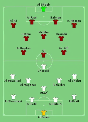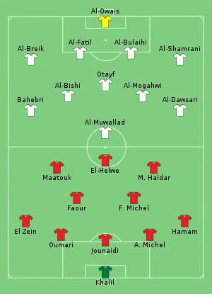 Saudi Arabia found their breakthrough in the 12th minute when they latched onto a defensive mistake. Lebanon’s Joan Oumari’s back pass deflected off teammate Alexander Michel Melki’s left boot, and the ball landed near Saudi Arabia’s Fahad Al-Muwallad, who half-volleyed home from close range. Oumari failed to keep his header down in the 16th minute, while Felix Michel Melki just missed Hassan Maatouk’s free-kick eight minutes later. After the break, Hattan Bahebri took a chance from almost 30 yards out which forced a save from goalkeeper Mehdi Khalil. Bahebri turned provider in the 67th minute when his cross into the box found Housain Al-Mogahwi who made it 2–0.[6] This win earned Saudi Arabia a ticket to the round of sixteen for the first time since the 2007 edition, in which Saudi Arabia finished runners-up.
