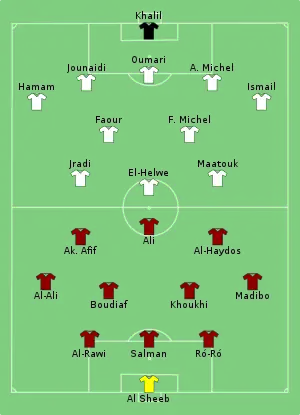 In the 37th minute, Ali Hamam raced off to celebrate with his teammates after slotting Hassan Maatouk’s corner into the Qatari goal, only for the referee to controversially blow the whistle for a foul on Tarek Salman. Maatouk pulled the trigger on an effort of his own just before half-time, but his scissor kick flew high over the bar. Two minutes after the hour mark, the 2018 AFC Player of the Year, Abdelkarim Hassan was introduced from the bench for Abdulkarim Al-Ali and within three minutes the Qataris took the lead from Bassam Al-Rawi's strike from a free kick. The defender sent a dipping curling right-footed effort over the wall and beyond the outstretched hand of Mehdi Khalil. Qatar added a second with 11 minutes remaining. Hassan’s driving run created space for Akram Afif and, when the winger received the ball, his centre found Abdulaziz Hatem, whose shot was saved by Khalil. But Almoez Ali was on hand to roll the ball into the empty net to ensure a winning start to the campaign for Qatar.[5]