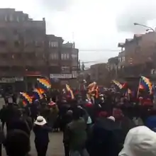 Reactions to the transfer of power and to Ms Áñez's assumption of the presidency have been mixed, being met with both celebrations and protests.[96] Demonstrators celebrating the removal of the government chanted "yes we can" and set off fireworks.[97] Hundreds of supporters of Morales made their way toward the center of La Paz from the mountains surrounding the city, some of them armed with sticks, chanting "here we go, civil war".[98]