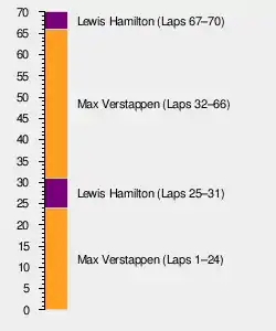 At the front, Verstappen pitted at the end of lap 25 for hard tyres, giving Hamilton a temporary lead. Hamilton then tried to push to overcut Verstappen on pit stop strategy but failed to make ground and was pitted on lap 32 for hard tyres, emerging about 5 seconds behind Verstappen. Immediately Hamilton went on the attack, however the two leading cars had to pick their way through traffic as they lapped slower cars. Whilst this slowed both drivers' progress, the presence of the lapped cars also gave Verstappen DRS allowing him to stay ahead of Hamilton. At the end of lap 38, Verstappen was held up by Ricciardo and then made a small mistake on the exit of turn twelve allowing Hamilton to close to 0.3 seconds. Both had DRS as they started lap 39 but Hamilton managed to pull almost alongside into turn one as they lapped Ricciardo. Unable to make the move, Hamilton continued to fight through turns two and three before launching a brave sortie into turn four that saw him run wide and fall back behind Verstappen.