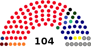 The 104 members of the National Assembly consist of 96 elected members and eight (non-voting) members appointed by the President.[5] The 96 elected members are elected by closed list proportional representation from 14 multi-member constituencies based on the regions. Seats are allocated using the largest remainder method.[6]