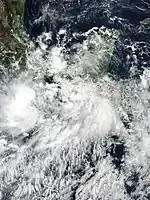 The tropical wave that spawned Cosme was succeeded a week later by another. It entered the East Pacific on July 8 but remained disorganized for several days while tracking west. The wave gave way to an area of low pressure on July 12, which then organized into a tropical depression only six hours later. The depression was located over very warm ocean temperatures but under the influence of moderate wind shear, preventing organization. By July 12, persistent upper-level winds began to shear away the cyclone's convection. It degenerated to a remnant low at 00:00 UTC on July 14 while located south-southwest of Baja California Sur. The low produced intermittent bursts of convection as it moved west-northwest but ultimately dissipated early on July 15.[15]