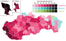 Zuzana Čaputová of the Progressive Slovakia party finished far ahead of the other candidates, receiving 40.6% of the votes, but failed to achieve the necessary threshold of 50%+1 vote from all registered voters to avoid a run-off. Maroš Šefčovič, the Vice-President of the European Commission for the Energy Union, who was running as an independent supported by the governing Smer-SD,[91] was the runner-up with 18.7% of the vote and earned the other place in the run-off. Voter turnout in the first round was 48.74%, the highest percentage for that stage of presidential elections since direct voting for the position was introduced in 1999.[92]