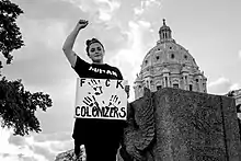 An American Indian Movement group tore down a statue of Christopher Columbus outside the state capitol building in Saint Paul on June 10 as the global protest movement turned towards removing monuments and memorials with controversial legacies.[44] Members of the American Indian Movement, led by Mike Forcia of the Bad River Band of the Lake Superior Tribe of Chippewa Indians, announced via social media their intentions to topple the statue earlier in the day. State Patrol troopers and a Department of Public Safety tribal liaison met with organizers prior to the event,[45] encouraging them to follow a legal process for removal[46] and warning them that they could face charges for destruction of public property.[45][46] Forcia countered that they had already waited far too long, having worked through official channels for years without success.[45][46][47] American Indian Movement members and other demonstrators, including Dakota and Ojibwe community members,[45] looped a rope around the statue and pulled it off its granite pedestal. The group drummed, sang songs, and took photos with the fallen statue. No one was arrested at the event. State Patrol troopers watched from a distance and did not intervene.[46] Troopers eventually formed a line to protect the statue before it was transported offsite.[45] In December, Michael Forcia of Ramsey County agreed to a plea deal and accepted 100 hours in community service in connection with the incident. Officials estimated the cost to repair the statute would be over $154,000.[48]