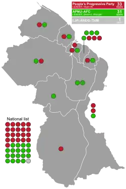 The results were publicly available, and almost exactly matched the SOPs in the possession of all the political parties and the observers. The results showed a victory for the PPP/C's presidential candidate with the PPP/C winning 33 seats in the National Assembly. APNU+AFC won 31 seats, and three of the smaller parties shared 1 seat in accordance with the agreement they made before the election.[57]
