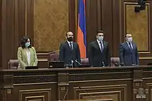 Shortly after the news about the signing the ceasefire agreement broke in the early hours of 10 November, violent protests erupted in Armenia against Nikol Pashinyan, claiming he was a "traitor" for having accepted the peace deal.[237] Protesters also seized the parliament building by breaking a metal door, and pulled the President of the National Assembly of Armenia Ararat Mirzoyan from a car and beat him.[238][239] Throughout November, numerous Armenian officials resigned from their posts, including the Armenian minister of foreign affairs, Zohrab Mnatsakanyan,[240] the minister of defence, David Tonoyan,[241] head of the same ministry's military control service, Movses Hakobyan,[242] and the spokesman of Armenia's Defense Ministry, Artsrun Hovhannisyan.[243]
