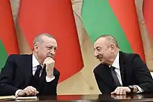 On 10 December, a victory parade was held in honor of the Azerbaijani victory on Azadliq Square,[295] with 3,000 military servicemen who distinguished themselves during the war marched alongside military equipment, unmanned aerial vehicles and aircraft,[296] as well as Armenian war trophies,[297] and Turkish soldiers and officers.[298] Turkish President Erdoğan attended the military parade as part of a state visit to Baku.[299]