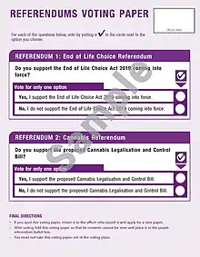 - "Referendum on the End of Life Choice Act 2019". referendum.govt.nz. New Zealand Government. Retrieved 28 January 2020.