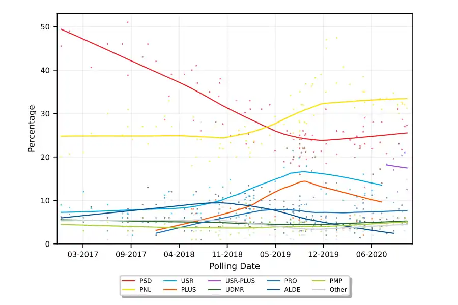 The chart below shows opinion polls conducted for the next Romanian legislative election. The trend lines represent local regressions (LOESS).
