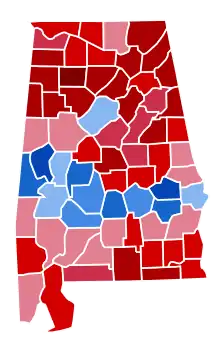 Prior to the election, all 14 news organizations making predictions considered this a state Trump would win, or otherwise a safe red state. In 2016, Trump won Alabama by a 27.72% margin,[5] the largest margin for any candidate in Alabama since Richard Nixon's 46.89% margin in 1972. In 2020, Trump won the state with 62.03% of the vote to Biden's 36.57%, a margin of 25.46%,[6] with Biden improving on Hillary Clinton's 2016 loss by 2.26%. This was the fifth election in a row in which the Republican nominee won over 60% of the vote in Alabama.[7] A socially conservative Bible Belt state, Alabama has voted for the Republican candidate in every election since 1980 and has done so by double-digit margins except in all of them except 1980, 1992, and 1996. The last time a Democratic nominee won the state was when fellow Southerner Jimmy Carter carried it in 1976, and it has not even given 40% of the vote to the Democratic nominee since 2000.