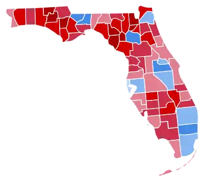 Prior to the election, aggregate polls had Joe Biden in the lead in Florida by up to almost 3 points. Despite this, Trump won the state by a 3.4% margin, improving upon his margin from 2016 over Hillary Clinton by 2.2%; it was the largest margin for any presidential election in Florida since 2004. This was due to increased support among Latino voters in the state, particularly in Miami-Dade County, which Biden carried by just a 7.3% margin, significantly lower than Clinton's 29.4% margin in 2016 or Obama's 23.7% margin in 2012.[8] Trump carried Latinos of Cuban heritage with 58%, while Biden carried Puerto Ricans with 66%, and Trump and Biden split the South American vote with 50% each.[9][10] Trump labeled Biden as a "trojan horse for socialism".[11] In this election, Florida voted 7.9 points right of the nation as a whole, the furthest it has voted from the nation since 1988, when Florida voted 14.6 points right of the nation.