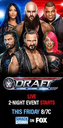 ![]() Promotional poster for the 2020 WWE Draft featuring Sasha Banks, Braun Strowman, Keith Lee, Roman Reigns, Drew McIntyre, and Asuka. | |