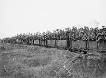 The 20th (Light) Division was authorised on 11 September 1914 and was to be composed of newly raised battalions from quick marching rifle and light infantry regiments.[1] The 59th[lower-alpha 1] and 60th[lower-alpha 2] Brigades were concentrated at Blackdown with the Division Headquarters and other division troops. The 61st Brigade[lower-alpha 3] was concentrated at Aldershot, where the medical component also trained, the Artillery was formed near Deepcut, the engineers were trained at Chatham.[2] Clothing, in the form of emergency Kitchener Blue uniforms did not arrive until November, together with a few old rifles for drill practice, the artillery had only two 90 mm guns and two 15-pounders per brigade. The supply situation had improved by February 1915 when the Division moved to Whitley, by which time the 11th DLI, which had a large number of miners in it had become the Division pioneer battalion, trading places in the 61st Brigade with the 12th King's Regiment, the original divisional troops battalion.[3] In April the Division marched to Salisbury Plain to complete its training and were joined by the field ambulances after their training in June. the Division was inspected by the King at the end of that month, and embarked for France in the later part of July.[4]