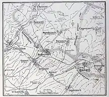The division returned to the front on 4 January, relieving the Guards 2.5 miles (4.0 km) south of Le Transloy in a line through the village of Sailley-Saillisel. Two brigades, the 60th and 61st were at the front with two battalions each in the fire trench, the Guards division was to the right and the 17th (Northern) to the left. The front line consisted of a series of isolated posts, some only 10 yards (9.1 m) from the Germans. The divisions artillery was once again under command of the division for a while as part of the Corp group, with 29th division's artillery and other units. Until relieved on 30 January by 17th (Northern) division, the 20th held the line repulsing German attacks with the machine gunners and artillery providing covering fire for other formations attacks.[43] On 10 February the division returned to the front, on the northern edge of their previous position and lost one of the more isolated advanced posts which was out of sight from the British line and which the division had been given permission to abandon shortly before its loss. By the beginning of March the British were aware that the Germans in tended to withdraw to a more favourable line.[44]