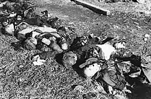 In April, the remnants of the division were moved south to the area around Goldberg. After the Prague Offensive, the division attempted to break out to the west, in order to surrender to the western Allies.[31] The Czech partisans resumed their hostilities on the surrendered Estonian troops regardless of their intentions. In what veterans of the Estonian Division who had laid their weapons down in May 1945 recall as the Czech Hell, the partisans chased, tortured and humiliated the Waffen SS men and murdered more than 500 Estonian POWs.[27][38][39] Some of the Estonians who had reached the western allies were handed back to the Soviets.[31]