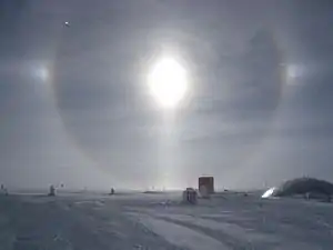 A 22° halo is an optical phenomenon that belongs to the family of ice-crystal halos. Its form is a ring with an apparent radius of approximately 22° around the Sun or Moon. When visible around the Moon, it is called a moon ring or winter halo. It forms as direct sunlight or moonlight is refracted in millions of hexagonal ice crystals suspended in the atmosphere.[1] The halo appears large; its radius is roughly the length of an outstretched hand at arm's length.[2] A 22° halo may be visible on as many as 100 days per year – much more frequently than rainbows.[3]
