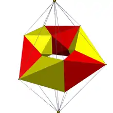 The 8 integer vertices (±1, 0, 0, 0) are the vertices of a regular 16-cell, and the 16 half-integer vertices (±1/2, ±1/2, ±1/2, ±1/2) are the vertices of its dual, the tesseract (8-cell). The tesseract gives Gosset's construction[11] of the 24-cell, equivalent to cutting a tesseract into 8 cubic pyramids, and then attaching them to the facets of a second tesseract. The analogous construction in 3-space gives the rhombic dodecahedron which, however, is not regular. The 16-cell gives the reciprocal construction of the 24-cell, Cesaro's construction,[12] equivalent to rectifying a 16-cell (truncating its corners at the mid-edges, as described above). The analogous construction in 3-space gives the cuboctahedron (dual of the rhombic dodecahedron) which, however, is not regular. The tesseract and the 16-cell are the only regular 4-polytopes in the 24-cell.[13]