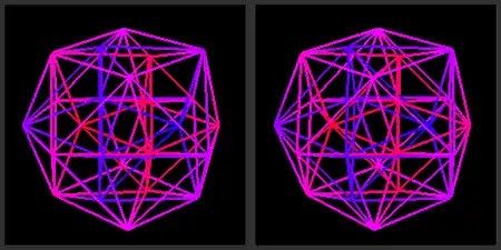 is a hexagon on the y axis. Unlike the √2 squares, the hexagons are actually made of 24-cell edges, so they are visible features of the 24-cell. - It is of course difficult to visualize four hexagonal planes that are all perpendicular to each other. One can see them in the cuboctahedron (a projection of the 24-cell into 3-dimensions), where they appear to be at 60 degrees to each other. In the 3 dimensional projection two of 4 non-orthogonal hexagons appear to intersect at each of 12 vertices, but these are actually 16 hexagons and 24 vertices. In 4 dimensions, 4 non-orthogonal hexagons do intersect at each vertex, but also four orthogonal hexagons intersect only at their common center, such that each one of them passes through a disjoint set of 6 of the 24 vertices.