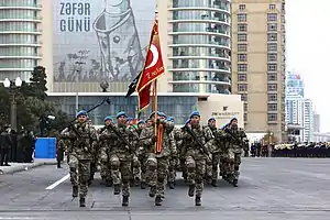 ![]() Personnel of the 2nd Commando Brigade (Turkey) blue berets with Brigade flag. | |