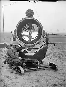 During the 1930s the growing threat of air attack led to the rapid expansion of the British Army's anti-aircraft (AA) units. At that time AA searchlights (S/Ls) were operated by the Royal Engineers (RE). The 2nd AA Battalion, RE, was formed in 1937 with two companies designated A and B. By 1938 it had been decided that the S/L responsibility should be transferred to the Royal Artillery (RA). On 24 May 1938 the 2nd AA Bn was disbanded and replaced by 2nd Searchlight Regiment, RA with A and B batteries.[1][2] It was formed at Portsmouth and the first commanding officer (CO) was Lieutenant-Colonel T.R. Anderson, MC, who had seen active service on the Western Front and in Mesopotamia during World War I.[3][4][5]