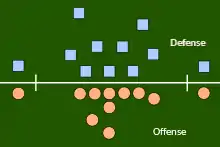 The 3–4 has two basic defensive variations: the one-gap and the two-gap. In a two-gap system, the linemen are charged with tying up two blockers. This allows the linebackers to "flow downhill" and make tackles without shedding blocks.[14] The one-gap, on the other hand, distributes the responsibility for gap coverage evenly between the linemen and linebackers. Each player has a few "key reads" after the ball is snapped. For example, the middle linebacker may be covering the strong side A gap (gap between center and strong side guard). If he sees the guard move right, then he flows with the guard, moving more or less laterally parallel to the line of scrimmage. If the guard moves left, he attacks downhill (perpendicular to the line of scrimmage) and "shoots his gap." Responsibilities in the one-gap vary depending on the defense.[15]