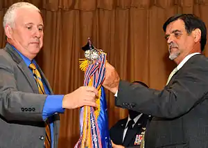 ![]() Dr. Bruce Simpson, Air Armament Center Deputy for Acquisition, helps Randy Brown, 308th Armament Systems Wing Director, roll up the guidon for the former 308th Wing, 30 July 2010, at Eglin Air Force Base, Florida. | |