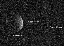3122 Florence is a stony[10] trinary[20] asteroid of the Amor group. It is classified as a near-Earth object and potentially hazardous asteroid. It measures approximately 5 kilometers in diameter. It orbits the Sun at a distance of 1.0–2.5 AU once every 2 years and 4 months (859 days); the orbit has an eccentricity of 0.42 and an inclination of 22° with respect to the ecliptic.[1] Florence has two moons.