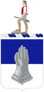 The regimental coat of arms was approved on 13 March 1925 and its distinctive unit insignia was approved on 14 March 1925. Both were rescinded on 2 March 1959. The distinctive unit insignia consisted of a 1 1/8 inch (2.86 cm) silver colored metal and enamel device with a shield divided in half by a gold line between blue and white with a gauntlet in the center. The regimental motto, "Semper Paratus" (Always Ready), was attached to the insignia on a scroll. The gauntlet symbolized the regiment's willingness to fight to defend the United States, as well as its honor and record. The gold line symbolized the Wisconsin–Illinois border, blue was the field of the Wisconsin flag, and white was the field of the Illinois flag. The coat of arms was of a similar design except that it omitted the motto and included the Organized Reserve Minuteman crest above the shield.[6]