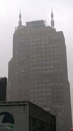 Upon buying 32 Avenue of the Americas, the Rudins planned to renovate the building into a "New York Global Connectivity Center".[15] By the September 11, 2001, attacks, the building was 75% occupied.[51] Between 2001 and 2002, 32 Avenue of the Americas underwent an extensive renovation by the architecture firm of Fox & Fowle, which included the installation of new mechanical and communications infrastructure. Numerous features of the building's original design were restored, including the lobby. A quarter of the building's windows were replaced with louvers which emulated the pattern of the original sash windows. Two 120-foot-tall (37 m) communications masts were installed, increasing the building's height from 429 feet (131 m) to 549 feet (167 m).[15][52] The erection of the telecommunications masts was approved by the Landmarks Preservation Commission, which stated that changes would be inevitable due to technological advances, although the commission said these changes would need to respect the building's existing architecture.[15]