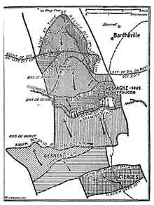 General de Mondesir, the 38th French Corps Commander, which the 32nd served under, went to the front to observe the fighting. When he saw how the 32nd cleared the Germans out of their reinforced positions with unrelenting and successful attacks, he exclaimed, Oui, Oui, Les soldats terrible, tres bien, tres bien! General Charles Mangin heard of it and referred to the 32nd Division as Les Terribles when he asked for the division to join his 10th French Army north of Soissons. He later made the nickname official when he incorporated it in his citation for their attack at Juvigny. The division's shoulder patch, a line shot through with a red arrow, symbolizes the fact that the 32nd Division penetrated every German line of defense that it faced during World War I.[1][15][16]