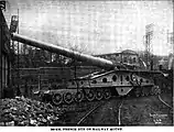 Due to the cancellation or conversion of most of the ships these guns were made for, the relatively large number of spare guns available facilitated their use as railway guns in both World Wars. Two batteries of 340 mm guns, with an authorized strength of one gun per battery, were operated by the 53rd Coast Artillery, U. S. Army, in World War I.[3] As with most French railway guns, after the Fall of France in World War II some of these weapons were used by the German army.