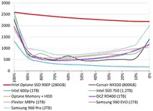 Despite the initial lukewarm reception when first released, 3D XPoint – particularly in the form of Intel's Optane range – has been highly acclaimed and widely recommended for tasks where its specific features are of value, with reviewers such as Storage Review concluding in August 2018 that for low-latency workloads, 3D XPoint was producing 500,000 4K sustained IOPS for both reads and writes, with 3–15 microsecond latencies, and that at present "there is currently nothing [else] that comes close",[23] while Tom's Hardware described the Optane 900p in December 2017 as being like a "mythical creature" that must be seen to be believed, and which doubled the speed of the best previous consumer devices.[6] ServeTheHome concluded in 2017 that in read, write and mixed tests, Optane SSDs were consistently around 2.5× as fast as the best Intel datacentre SSDs which had preceded them, the P3700 NVMe.[24] AnandTech noted that consumer Optane based SSDs were similar in performance to the best non-3D-XPoint SSDs for large transfers, with both being "blown away" by the large transfer performance of enterprise Optane SSDs.[25]