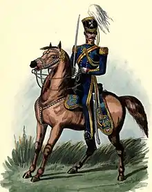 The regiment was renamed the 3rd (The King's Own) Regiment of (Light) Dragoons in 1818.[58] It served in Ireland between January 1820 and June 1822[59] and between March 1826 and April 1829.[60] It was dispatched in India in July 1837[61] and, having moved on to Afghanistan, saw action at the Battle of Kabul in September 1842 during the First Anglo-Afghan War.[62] It fought again at the Battle of Mudki and at the Battle of Ferozeshah in December 1845 and at the Battle of Sobraon in February 1846 during the First Anglo-Sikh War.[63] It then went on to fight at the Battle of Chillianwala in January 1849 and the Battle of Gujrat in February 1849 during the Second Anglo-Sikh War.[64] The regiment was renamed the 3rd (The King's Own) Hussars in 1861.[58] It was posted to India in 1868, was back in England in 1879, then had a brief posting to Scotland from 1887 before they were stationed in Ireland from 1889 to 1894. The regiment was back in India in 1898.[65] It was deployed to South Africa in December 1901 for service in the Second Boer War and was involved in the last great drives, capturing the boers, in the north-east of the Orange River Colony.[66] Following the end of the war in South Africa, 507 officers and men of the regiment returned to India on the SS Ionian in October 1902, where they were stationed in Sialkot in Punjab Province.[67]