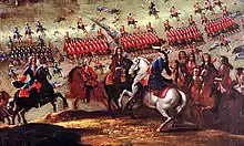 The remnants of the force, including the regiment, then marched 40 miles to Caudete to link up with an Allied army composed of English, Dutch, German and Portuguese troops under the command of the Earl of Galway. This army was to support Spanish forces loyal to Charles of Austria, who claimed that he was the legitimate heir to the Spanish throne; however, this claim was contested by his opponent, Philip of Anjou, who had gathered his own army and was determined to defeat Charles in battle.[29] The campaign against Anjou's forces began in March, with the Allies advancing, destroying several magazines and besieging the city of Villena; soon after beginning the siege, however, they were alerted by several French deserters that a large Franco-Spanish force was advancing towards Almansa to the north-east. The Earl of Galway was also informed that a second enemy force under the command of Philippe II, Duke of Orléans was marching to reinforce the first force; in response to this information the Earl advanced immediately in an attempt to prevent the two forces from linking up. However, the manoeuvre failed, leading to the 15,000-strong Allied army being opposed by 25,000 French and Spanish troops who also possessed a superior number of artillery pieces.[30] The two forces clashed during the Battle of Almansa, which began on the afternoon of 25 April. The battle began with both sides bombarding the others positions with artillery fire. After this general bombardment had ended, the Allied cavalry were dispatched to attack the centre of the Franco-Spanish positions; The Queen's Own Dragoon's were committed alongside Essex's Dragoons to attack an enemy artillery battery that was bombarding the Allied line. The regiment charged the battery and forced it to withdraw, but were then engaged by a force of Spanish cavalry that outnumbered them by approximately three to one according to regimental records, the ensuing battle 'nearly annihilated' the regiment, with its Colonel being killed along with a large number of officers and troopers.[31] The remnants of the two cavalry regiments retreated to the Allied lines, where volley-fire from the Allied infantry was beginning to inflict significant casualties on the Franco-Spanish forces; it was at this point, however, that the 7,000 Portuguese troops belonging to the Allied army suddenly deserted, starting with their cavalry and rapidly followed by the infantry. The desertion turned the tide of the battle and led to a Franco-Spanish victory, with 2,000 Allied infantrymen being taken prisoner and the remnants of the Allied army being routed.[31] The Allied army suffered approximately 4,000 killed and wounded and another 3,000 taken prisoner; whilst there are no specific casualty numbers for the regiment, when it returned to England in the spring and began recruiting, it could only muster 150 troopers and officers.[32]