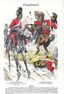 In July 1809, the regiment departed for the Netherlands and took part in the disastrous Walcheren Campaign: many of the men caught a disease called "Walcheren Fever", thought to be a combination of malaria and typhus, before returning home in September.[49] In April 1810 the regiment was tasked with restoring order after the riots caused by protesters objecting to the incarceration of Sir Francis Burdett in the Tower of London.[50] The regiment landed in Lisbon in August 1811 for service in the Peninsular War.[51] It took part in the Siege of Ciudad Rodrigo in January 1812 and the Siege of Badajoz in March 1812[52] and then undertook successful charges at the Battle of Villagarcia in April 1812[53] and at the Battle of Salamanca in July 1812.[54] The regiment next saw action at the Battle of Vitoria in June 1813[55] and then, having pursued the French Army into France, at the Battle of Toulouse in April 1814.[56] The regiment returned home in July 1814.[57]
