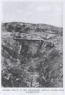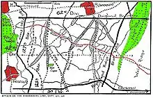 On 27 September 1918 it attacked and advanced Havrincourt Wood through the Siegfried Stellung section of the Hindenburg Line via successive planned objectives denoted Black, Red, Brown, Yellow, Blue Lines, to Welsh Ridge.[60] The Hindenburg Line was attacked in enfilade, or diagonally, as can be seen from the map. Many casualties were sustained from machine guns situated in Beaucamps to the right of the Division's front during the Battle of the Canal du Nord. Its infantry relieved by New Zealand Division and withdrew to Havrincourt Wood for rest on 29 September 2018. The divisional artillery remained in action in support of the New Zealand Division in the Pursuit to the Selle.[61]