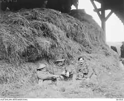 ![]() Troops from the 44th rest near Bonnay, after fighting there during the German Spring Offensive, April 1918 | |