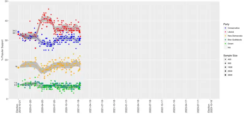 The 44th Canadian federal election will take place on or before October 16, 2023, to elect members of the House of Commons to the 44th Canadian Parliament. The latest possible date of the vote is determined by the fixed-date provisions of the Canada Elections Act, which requires federal elections to be held on the third Monday in October in the fourth calendar year after the polling day of the previous election.[3] Since the current government is a minority government, the election may be held before the scheduled date if Parliament is dissolved by the Governor General of Canada due to a motion of no confidence in the government or at the recommendation of the Prime Minister of Canada for a snap election.[4][5][6]