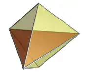 ![]() The face-first projection of the 5-cell into 3 dimensions also has a triangular dipyramidal envelope. The nearest face is shown here in red. The two cells that meet at this face project to the two halves of the dipyramid. The remaining three cells are on the far side of the pentatope from the 4D viewpoint, and are culled from the image for clarity. They are arranged around the central axis of the dipyramid, just as in the edge-first projection. |