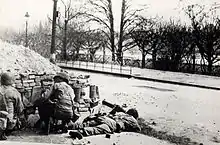 The 504th deployed a captured German halftrack armed with a 70mm gun manned by two paratroopers with no training in its use. They were successful in knocking out several enemy positions. Still, the 504th took very heavy losses crossing the open field, and at 1700 were ordered to withdraw 200 yards (180 m) to the edge of a wood. Colonel Tucker ordered the 1st Battalion to engage in an assault on the German forces in Cheneux that night.[1][8] The Devils pressed forward, and by nightfall had given the Germans their first defeat of the Battle of the Bulge.[1][8] Through heavy fire, Companies B and C wiped out an estimated five companies of German forces, as well as fourteen flak-wagons, six half-tracks, four trucks, and four 105mm howitzers.[9] However, the two companies were decimated, with 23 killed and 202 wounded; eighteen enlisted men remained in Company B, and thirty-eight men and three officers in Company C.[9] Company A of the 1st Battalion, 504th, as well as the first platoon of Company C of the 307th Airborne Engineer Battalion, were awarded the Presidential Unit Citation for their outstanding performance during this action.[9]