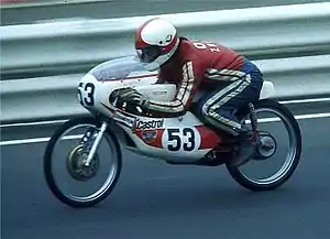 The relative low cost and increasing availability of 50 cc motorcycles in the post-war period, spawned a number of club road racing events for this size of machine in the early 1950s. With the earliest events being held in Italy[1] and in the UK.[2] The potential of this class for providing entertaining but affordable racing was soon recognised with several national championships and in 1961 the FIM introduced The Coupe d' Europe, a series of international events for 50 cc machines, each with a minimum duration and run to established Grand Prix rules and regulations.[3] The series attracted a variety of entries, but the dominating force were the work's Kreidler team bikes. Based on a standard Kreidler Florett road bike, their single cylinder Kreidler Renn-Florett's featured lightweight frames, a special cylinder head and barrel, twin 16 mm Bing carburettors feeding the engine through rotary valves and improved suspension and brakes. By the end of the season, with the addition of rudimentary streamlining and the increase of carburettor size to 17 mm, the 9 hp (6.7 kW) four-speed two-stroke bikes could top over 85 mph.[4]