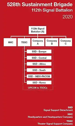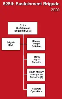 The 528th Sustainment Brigade (SO) (A) consists of a brigade staff, a support operations unit, and three battalions: the Special Troops Battalion, the 112th Special Operations Signal Battalion, and the 389th Military Intelligence Battalion.[2][5]