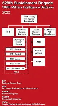 - 528th Sustainment Brigade - 389th MI Battalion Organizational Chart 2020, 528th Sustainment Brigade History Handbook Published by the U.S. Army Special Operations Command History Office Fort Bragg, North Carolina 2020, by Chris Howard ARSOF Support Historian, dated 5 December 2020, last accessed 12 December 2020