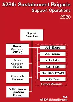 The 528th Sustainment Brigade (Special Operations) (Airborne), 528th Sustainment Brigade (SO) (A), or 528th SB (SO) (A) was activated on 16 December 2008, as part of the overall United States Army Special Operations Forces logistics transformation. The brigade replaced the Special Operations Support Command (Airborne) (SOSCOM) as combat service support and combat health support unit for all Army Special Operations Command (USASOC) units under the 1st Special Forces Command (Airborne) (1st SFC).[2]