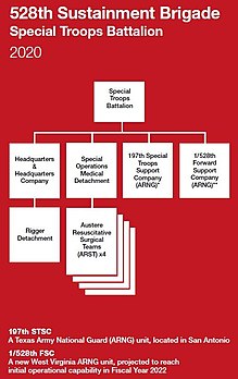 The Special Troops Battalion (formerly known as the 528th Support Battalion (A)) provides rapidly deployable combat service support and health service support to ARSOF and consists of a headquarters company with an organic rigger detachment, a special operations medical detachment with four Austere Resuscitative Surgical Teams (ARSTs)—formally known as Special Operations Resuscitation Teams (SORTs)[6][7]—the 197th Special Troops Support Company from the Texas Army National Guard, and 1/528th Forward Support Company from the West Virginia Army National Guard.[2][8]