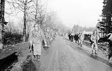 The evening of the next day they carried out the raid against the Oberst Friederich Kittel's 62nd Volksgrenadier Division in the tiny hamlet of Noirefontaine, taking 18 casualties in the process.[6] They faced Kittel's stubborn troops again. From 3–8 January 1945, they assaulted the small hamlets of Mont-de-Fosse, St. Jacques, and Dairomont. According to the unit's Presidential Unit Citation, "On 4 January, the battalion conducted a rare fixed bayonet attack of machine gun nests that killed 64 Germans."[7] Fighting through the thick woods cost the 551st heavy casualties. On the morning of 7 January, down to only 250 men, they were next charged with taking the village of Rochelinval, Belgium, along the Salm River.[8]