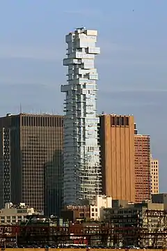 56 Leonard Street (known colloquially as the Jenga Building[2]) is an 821-foot-tall (250 m), 57-story[1] skyscraper on Leonard Street in the neighborhood of Tribeca in Manhattan, New York, United States. The building was designed by the Swiss architecture firm Herzog & de Meuron, which describes the building as "houses stacked in the sky."[3] It is the tallest structure in Tribeca.[4]
