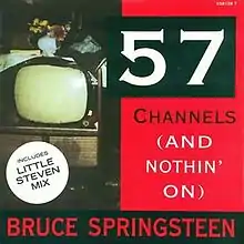"57 Channels (And Nothin' On)" is a song written and performed by Bruce Springsteen, appearing on his album Human Touch, released in 1992. The song was released as a single, charting in the Top 100 in various countries. A video for the song was also released. The title may be a reference to cable television, which carries more channels than terrestrial television.
