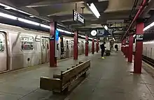 57th Street station contains two tracks and a single island platform serving both tracks.[29] The platform is 615 feet (187 m) long, and is 24 feet (7.3 m) wide. The station stretches from 55th Street to 58th Street. From the full-length mezzanine, which is 48 feet (15 m),[30] there are six staircases to the platform. The station walls are plain white, with "57th St" stenciled on long, narrow tiles along the wall.[31] The platform is approximately 35 feet (11 m) below ground.[5]
